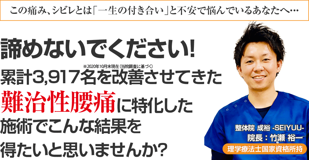 あなたが上述している様にお悩みがあり、心の奥底から「痛いし辛い、もうこんな腰痛の体で過ごすのは嫌だ。よくなりたい!!」と思われているのなら、整体院 成裕-SEIYUU-でそのずっと我慢していた腰痛を根本から改善をしませんか?という事です。