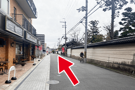 3左に曲がっていただくとそこに、ケーキ屋さんと西大寺(お寺)が出てきます。そのままずっと真っ直ぐに歩いていきます。