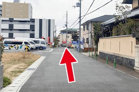 1大和西大寺駅から南出口を出て、矢印の方向に進んでいくと、交番が左側に見えてきます。