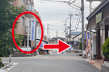 4そのまま北村皮膚科が見えるところまでずっと真っ直ぐに歩いていきます。北村皮膚科が見えてきますと、右側にシャーメゾンという賃貸マンションが出てきます。