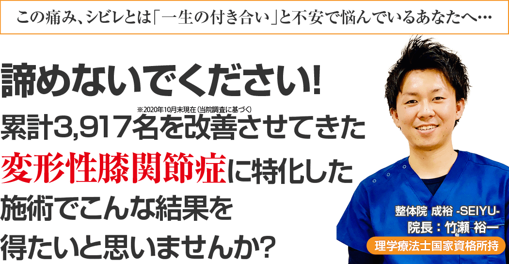 あなたが上述している様にお悩みがあり、心の奥底から「痛いし辛い、もうこんな変形性膝関節症の体で過ごすのは嫌だ。よくなりたい!!」と思われているのなら、整体院 成裕-SEIYUU-でそのずっと我慢していた変形性膝関節症を根本から改善をしませんか?という事です。