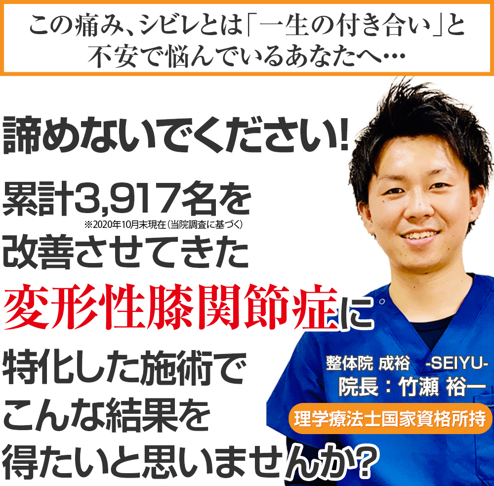 体のプロとしての証である国家資格を持ち、数百万以上かけて勉強してきた技術、数多くの慢性変形性膝関節症の方から支持され、あなたの症状に真正面から向き合ってくれる奈良市で唯一の慢性変形性膝関節症専門整体院 成裕 ーSEIYUUーに来院し、もう二度とその痛みに我慢することのない人生を手に入れる道。