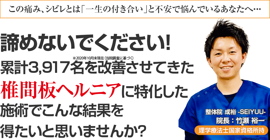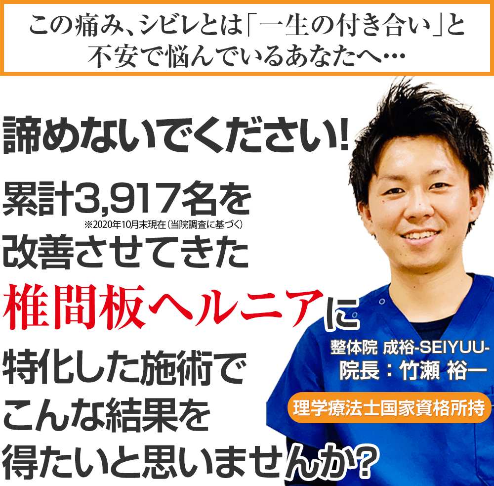 あなたが上述している様にお悩みがあり、心の奥底から「痛いし辛い、もうこんな椎間板ヘルニアの体で過ごすのは嫌だ。よくなりたい!!」と思われているのなら、整体院 成裕-SEIYUU-でそのずっと我慢していた椎間板ヘルニアを根本から改善をしませんか?という事です。