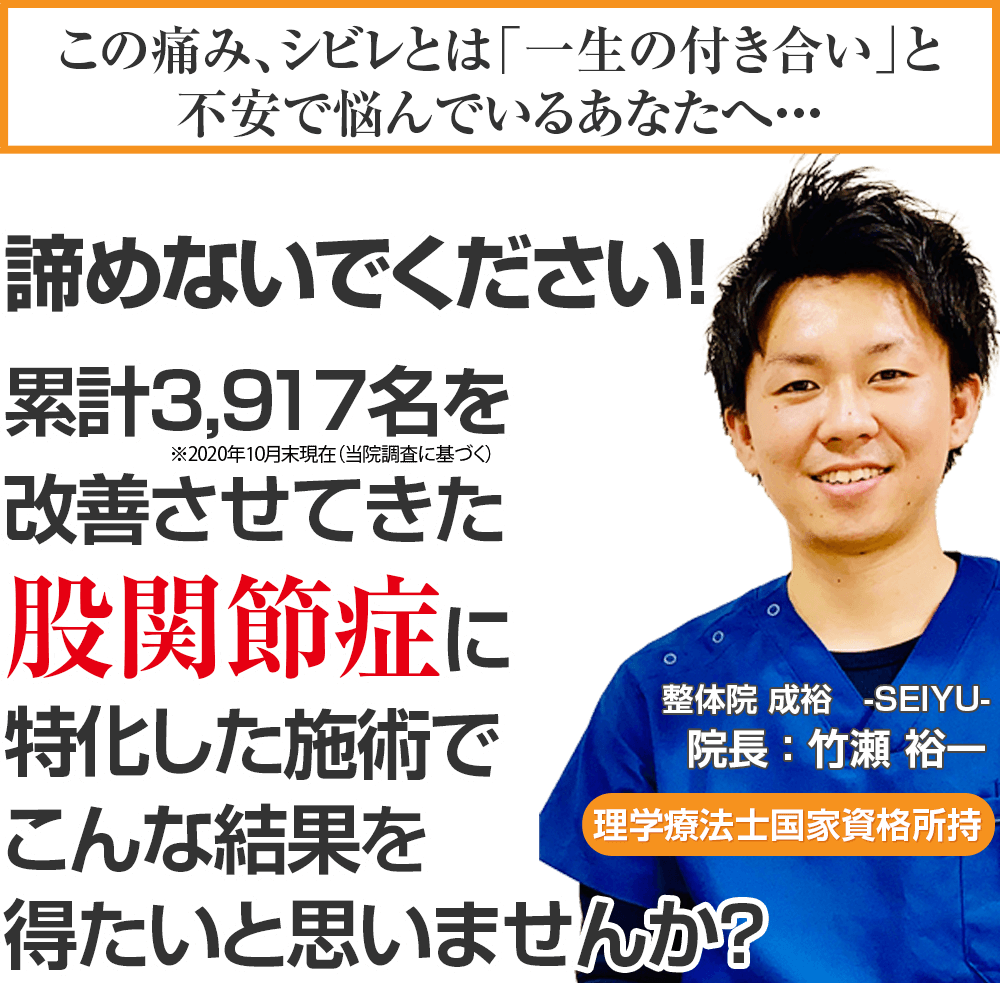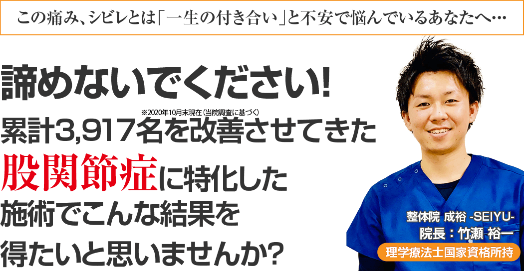 あなたが上述している様にお悩みがあり、心の奥底から「痛いし辛い、もうこんな股関節痛の体で過ごすのは嫌だ。よくなりたい!!」と思われているのなら、整体院 成裕-SEIYUU-でそのずっと我慢していた股関節痛を根本から改善をしませんか?という事です。